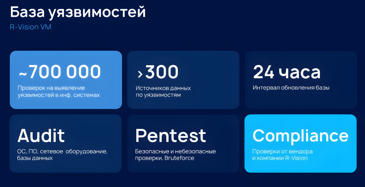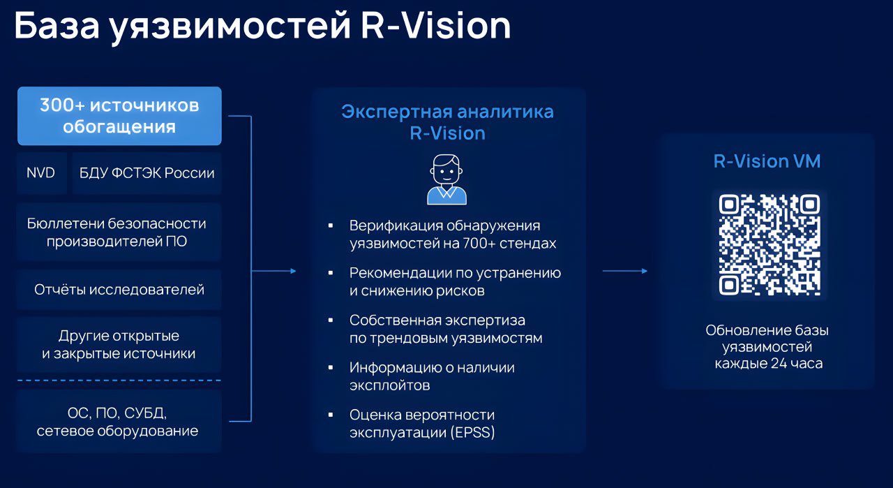 🎯 При формировании своей базы уязвимостей R-Vision делали упор на качестве (актуальности данных и корректности логики детектирования), независимости от единственного источника (к которому могут закрыть доступ), максимизации охвата ИТ-инфраструктуры заказчиков и быстроте добавления новых источников.