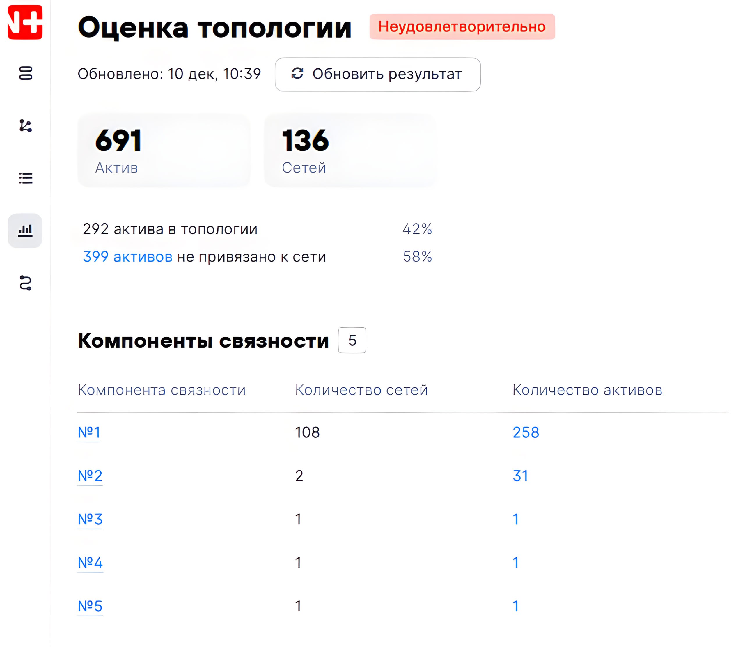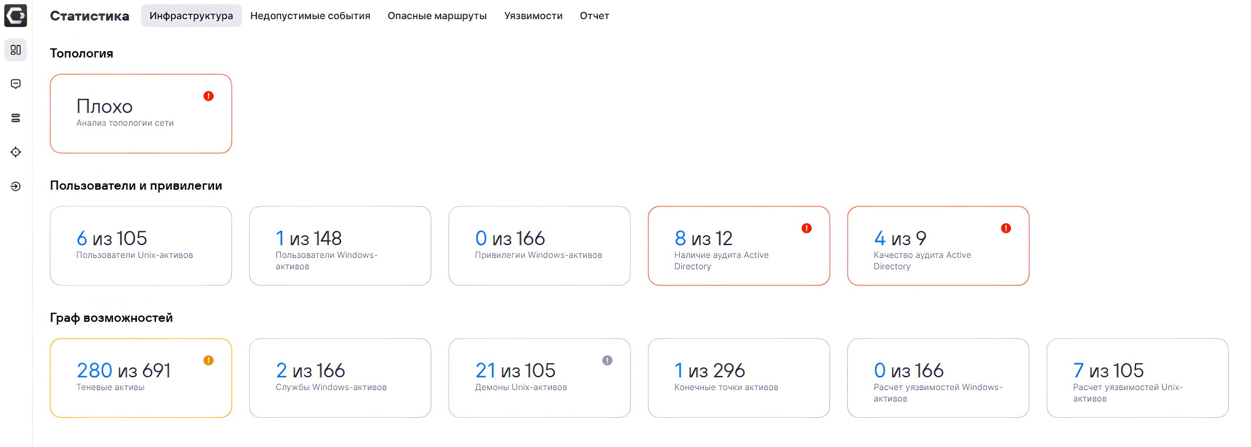🔹 Начали оценивать готовность инфраструктуры к моделированию кибератак (топология, пользователи и привилегии, граф возможностей). Для "отличной" оценки топологии в ней должно быть более 80% всех активов + выполняться доп. условия. При клике по остальным показателям, например по "Теневым активам", открываются результаты выполнения соответствующего PDQL-запроса в MaxPatrol VM.