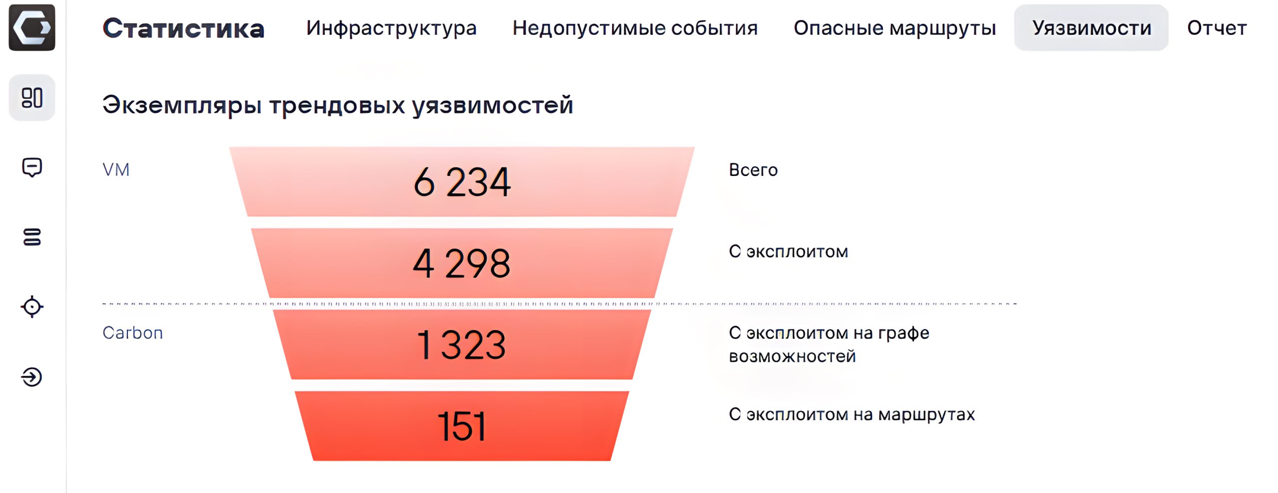 🔹 Добавили виджет с воронкой от всех экземпляров трендовых уязвимостей в инфре до трендовых уязвимостей с эксплоитами и просчитанными маршрутами для реализации заданных недопустимых событий.