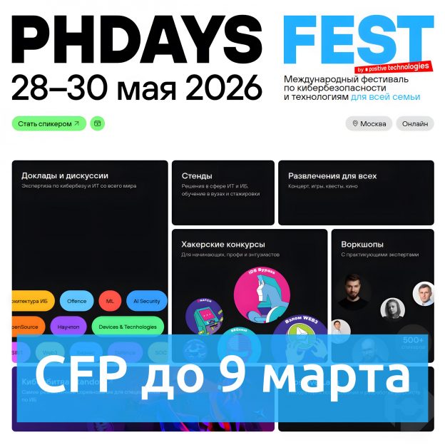 Стартовал Call For Papers на международный фестиваль по кибербезопасности и технологиям PHDays Fest 2026. Фестиваль пройдёт 28-30 мая в Москве.