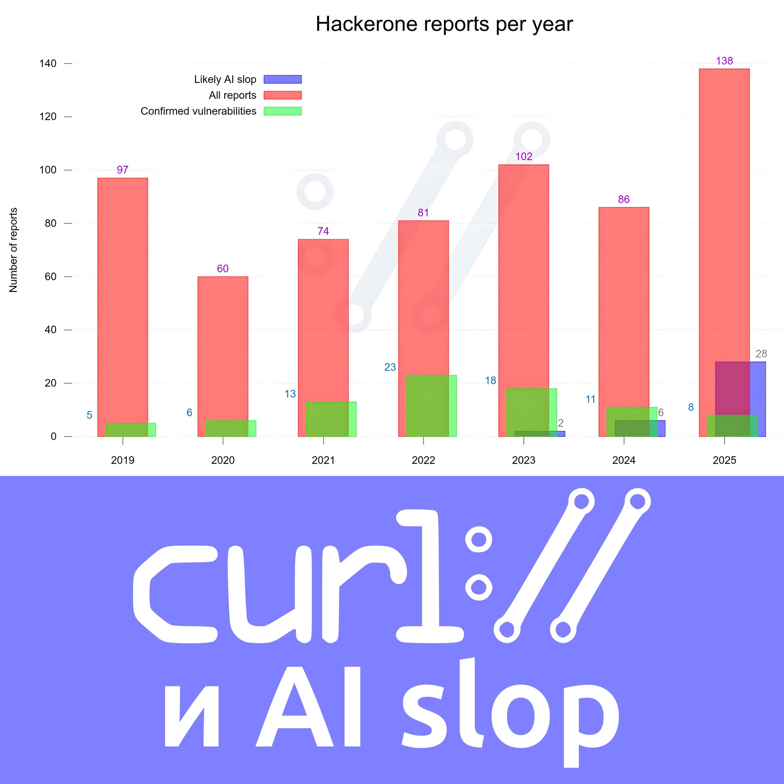 Пару недель назад Daniel Stenberg, основатель опенсурсного проекта curl, поделился статистикой по багрепортам на HackerOne. Из статистики видно, что количество подтверждённых уязвимостей падает, а общее количество репортов год от года растёт, в том числе из-за стремительного роста генерённого AI Slop-а.
