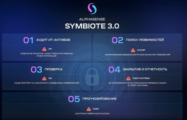🖼 Вводную часть построили на сравнении ИБ в компании и здоровья человека: проактивный VM - аналог "чекапа организма". Решение ALPHASENSE SYMBIOTE 3.0 (2.0 было в сентябре) позиционируют как альтернативу сложному, долгому, ограниченному пентесту. Движутся в сторону Continuous Exposure Management.