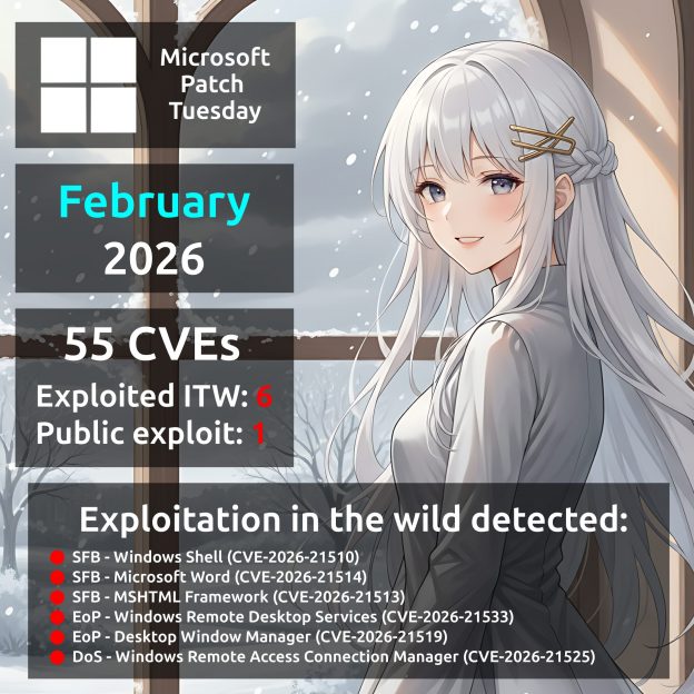 Февральский Microsoft Patch Tuesday. Всего 55 уязвимостей, в два раза меньше, чем в январе. Есть целых шесть (❗️) уязвимостей с признаком эксплуатации вживую: