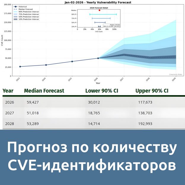 FIRST выложили 11 февраля прогноз по количеству новых CVE-шек, которые заведут в 2026 году и в последующие годы. В 2026 году целятся в 59 427, но предполагают интервал от 30 012 до 117 673. В настолько широкий интервал наверняка попадут. 😉