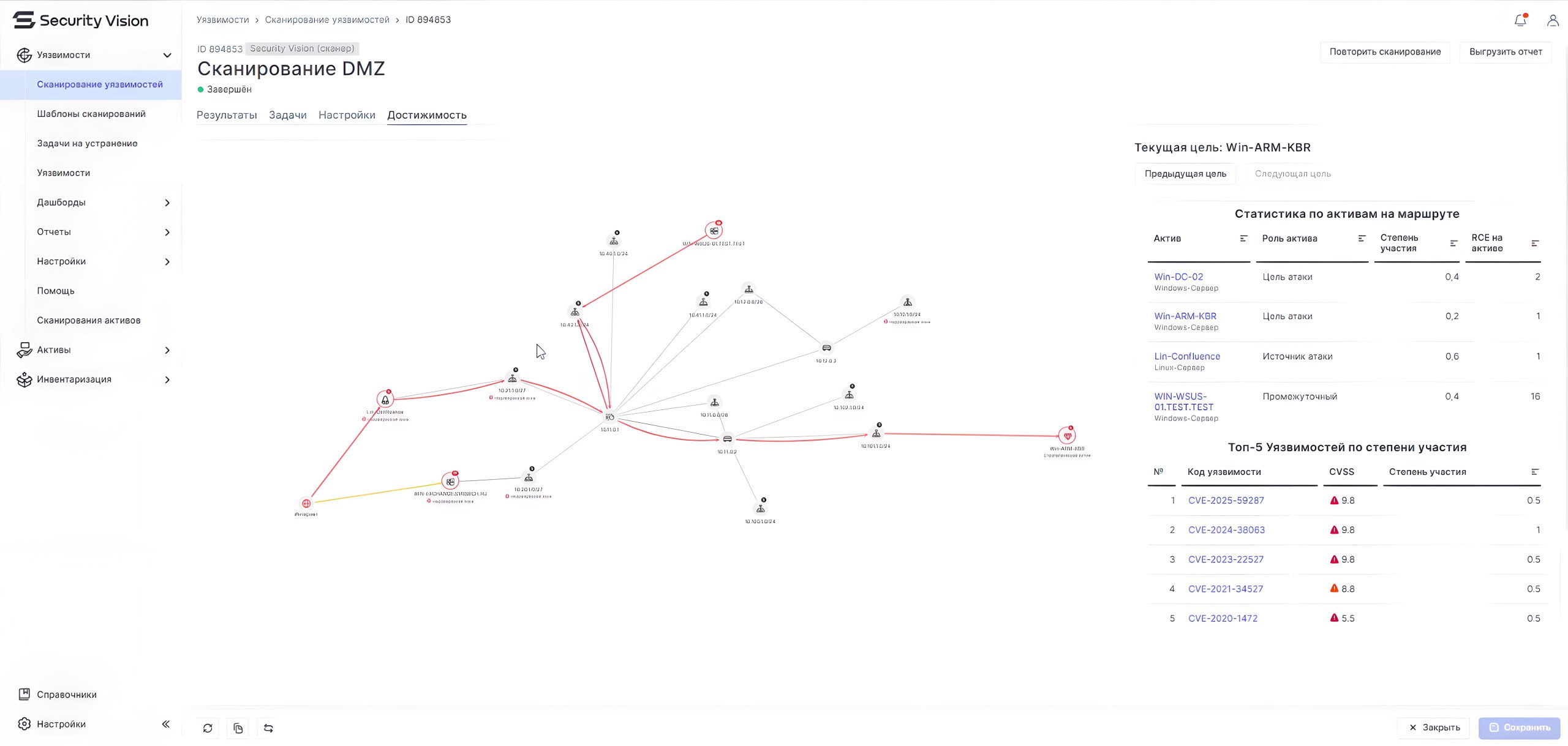 🔴 Красные связи показывают достижимость атаки до критических активов через эксплуатацию уязвимостей на хостах.