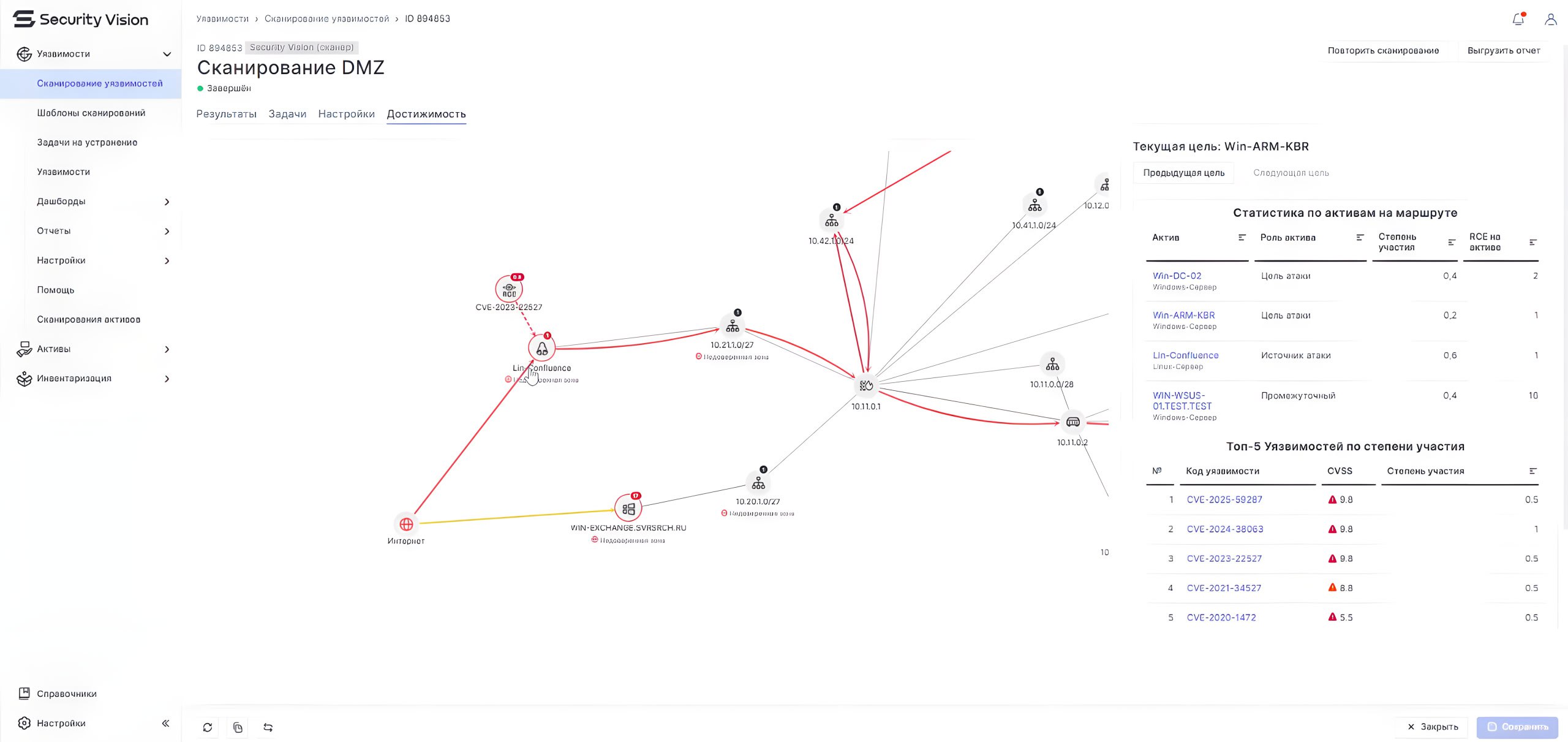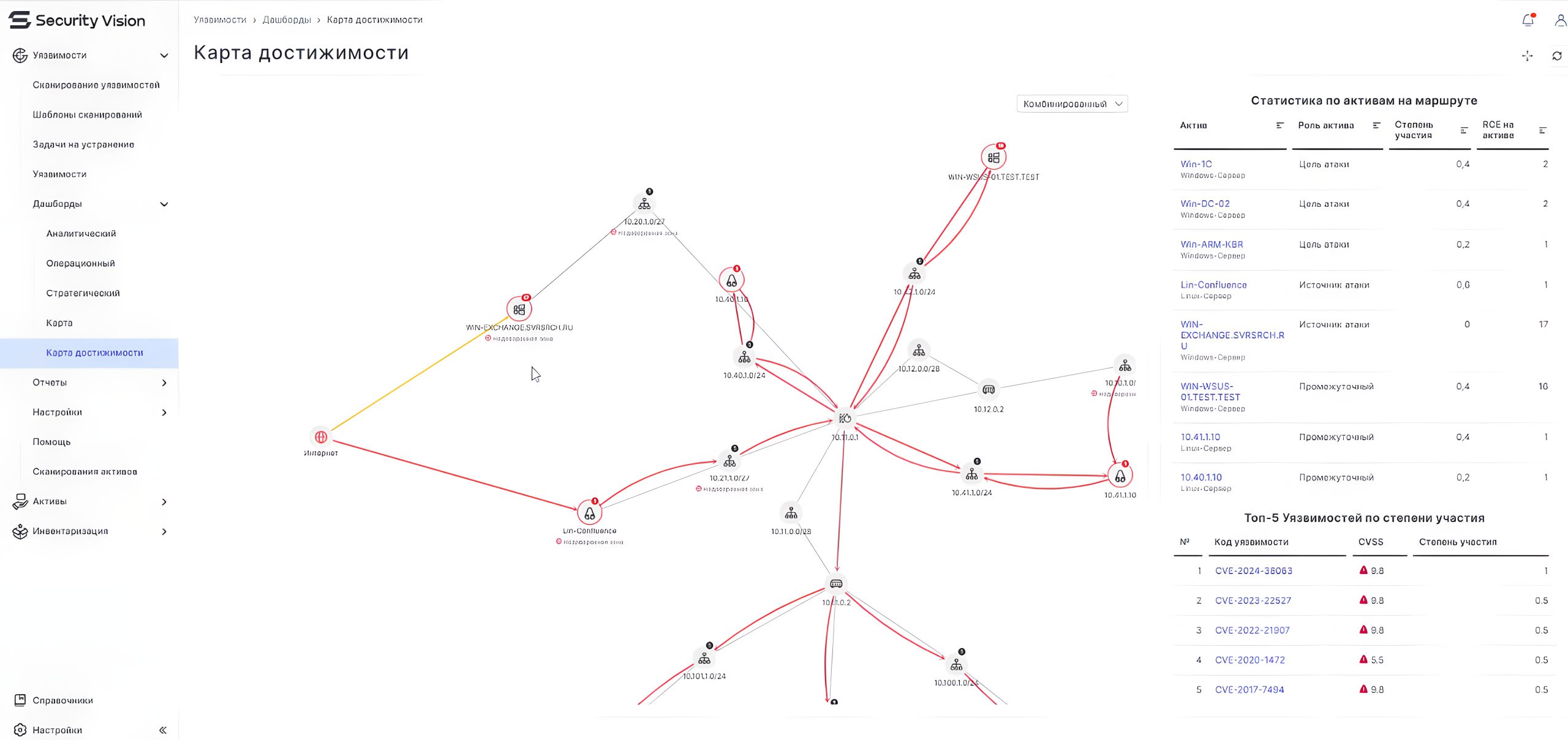 В правой части дашбордов есть таблички с ТОПом активов и их уязвимостей с параметром "степень участия". Этот параметр некоторым образом проприетарно высчитывается и характеризует степень участия актива или уязвимости в потенциальной атаке. Соответственно, следует в первую очередь обращать внимание на активы и уязвимости с максимальной степенью участия. Так на скриншоте можно видеть публично доступный Linux хост с Confluence (с.у. 0,5) уязвимый к CVE-2023-22527 (с.у. 0,5) и виндовую RCE CVE-2024-38063 (с.у. 1).